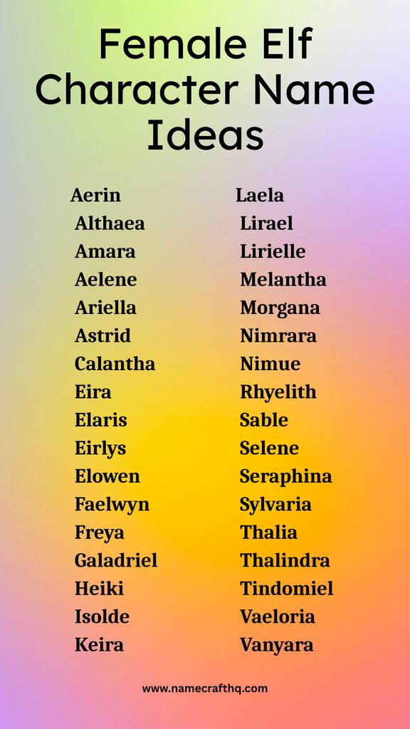 Consider Magical Specialties – Select names hinting at magical talents (Nimrara for illusion weavers, Lirielle for musically-gifted elves).