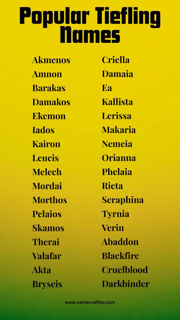 - Regular Names: Many tieflings use names from the human towns or cities where they grew up. These help them blend in better with regular people.
